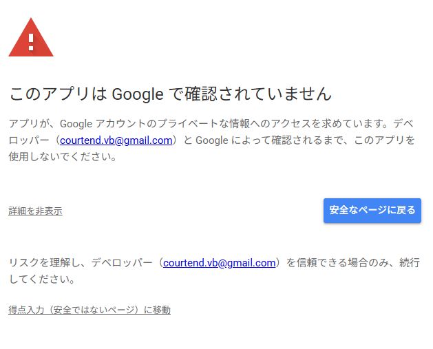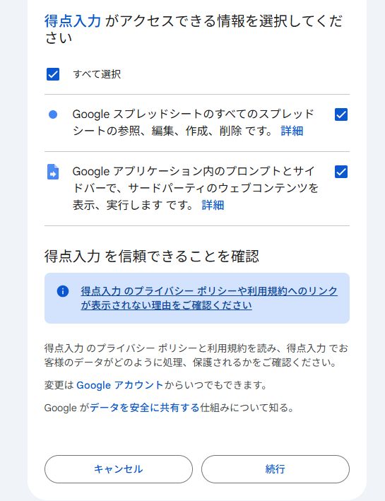 ⚠️ 初回のみ「承認」が必要です! 初めてボタンを押すと、Googleから警告が出ます。 「詳細」をクリック → 「〇〇(安全ではないページ)に移動」 → 「許可」 > の順に進めてください。一度許可すれば、次からはすぐ開きます。得点入力のためにGASというgoogleのプログラミング言語を使っているので、このようなメッセージが出ます。危険なものは何もないので安心して進めてください。