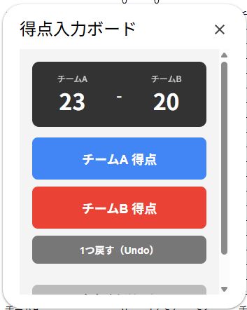 • 入力: ラリーが終わるたびに、得点した方のボタンを押すだけです。